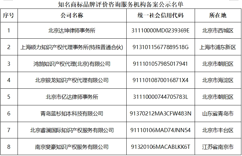 根据中华商标协会《知名商标品牌评价工作管理办法》《知名商标品牌评价咨询服务机构备案管理办法》有关规定,以下知名商标品牌评价咨询服务机构已向我会提交从事知名商标品牌评价咨询服务工作的备案申请,经初步审核基本符合备案条件,现予以公示。