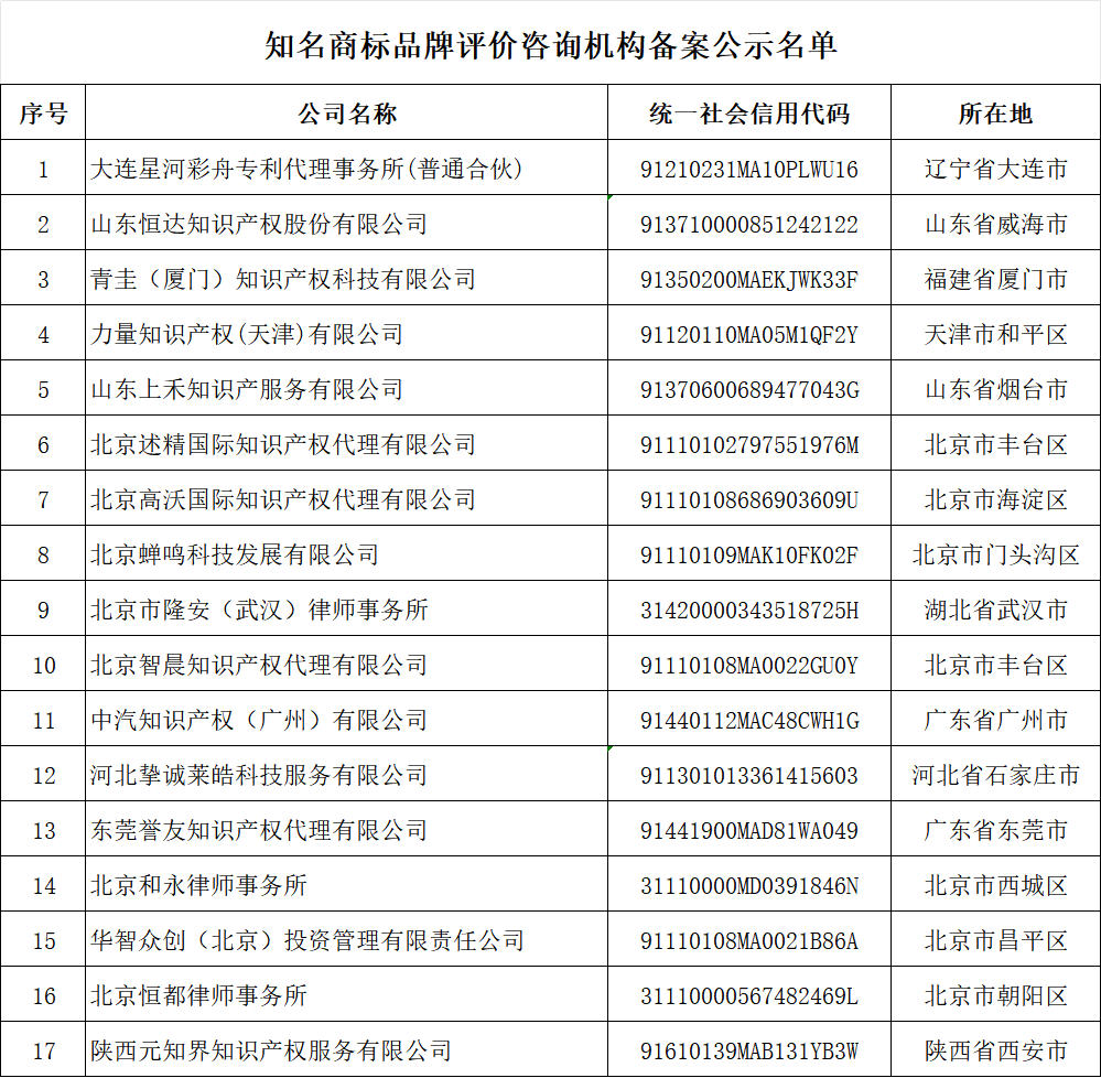 根据中华商标协会《知名商标品牌评价工作管理办法》《知名商标品牌评价咨询服务机构备案管理办法》有关规定,以下知名商标品牌评价咨询服务机构已向我会提交从事知名商标品牌评价咨询服务工作的备案申请,经初步审核基本符合备案条件,现予以公示。