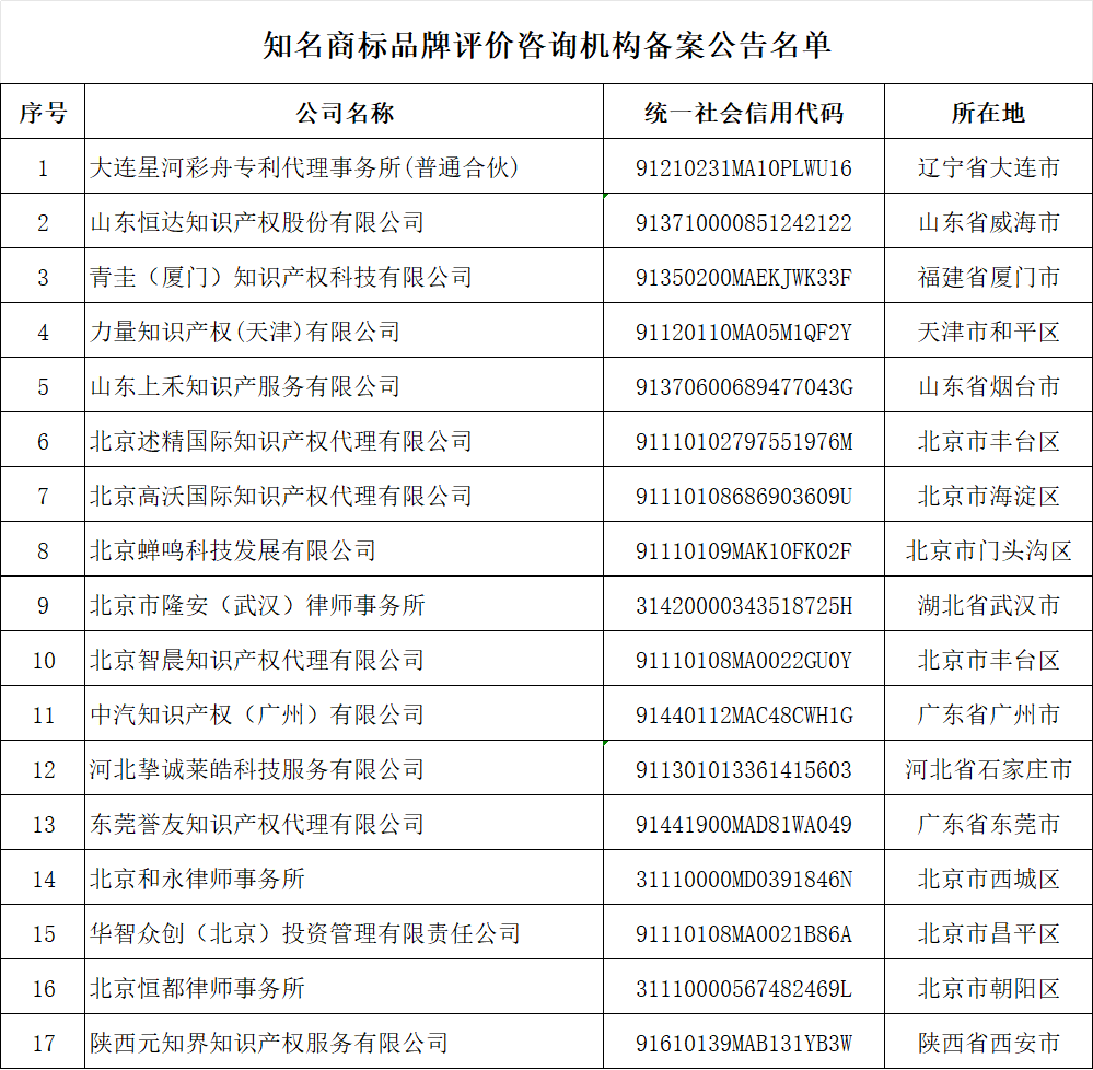 根据中华商标协会《知名商标品牌评价工作管理办法》《知名商标品牌评价咨询服务机构备案管理办法》有关规定,以下知名商标品牌评价咨询服务机构在2026年4月3日至2026年4月10日公示期内未接到异议反馈,符合从事知名商标品牌评价咨询服务工作备案条件,现予公告。